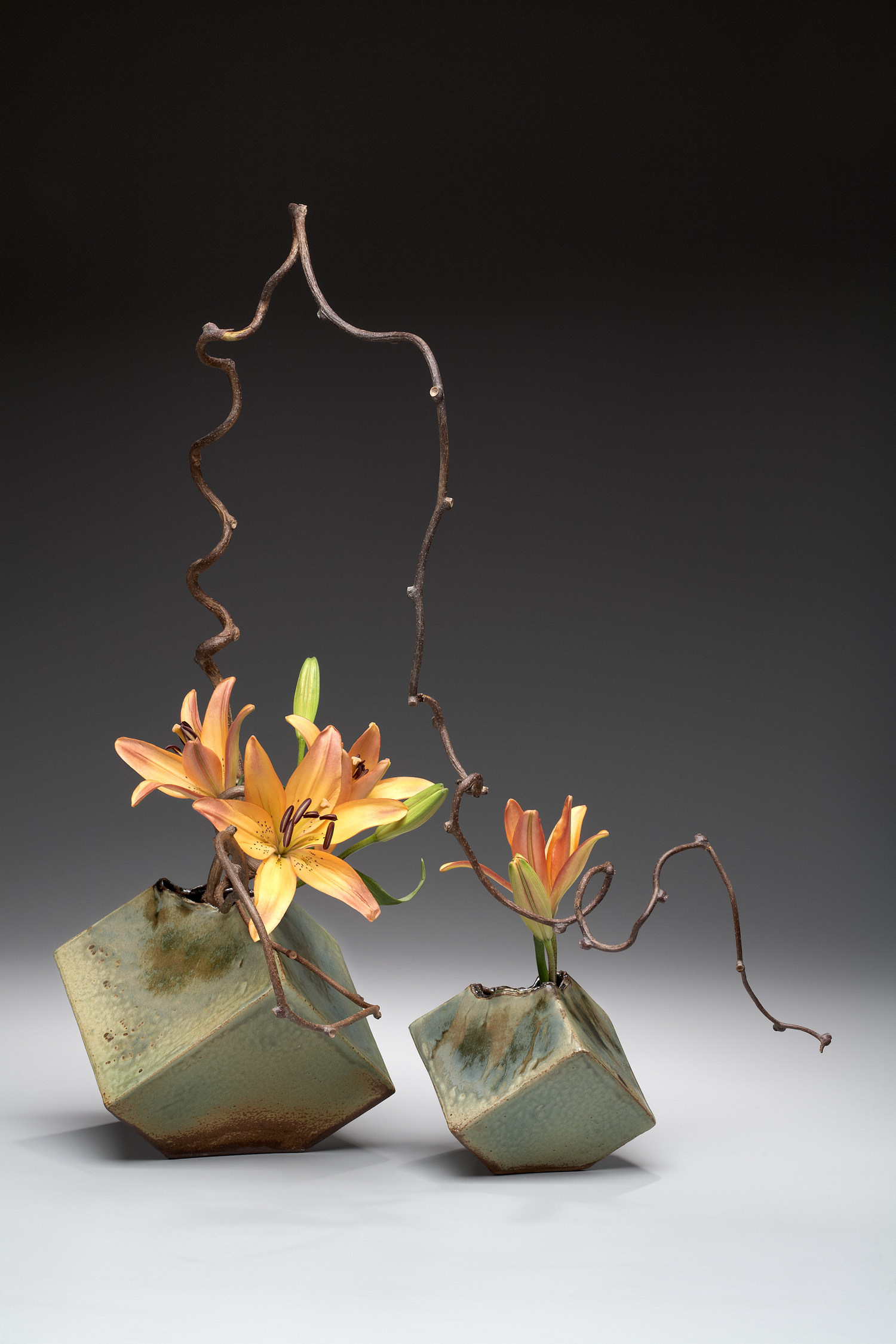 Pottery – Ikebana Ikebana Vases and Vessels cube wheel thrown and altered suiban Amigos nesting bowls, Ikebana globe and coil-built basket hand built trillium vase